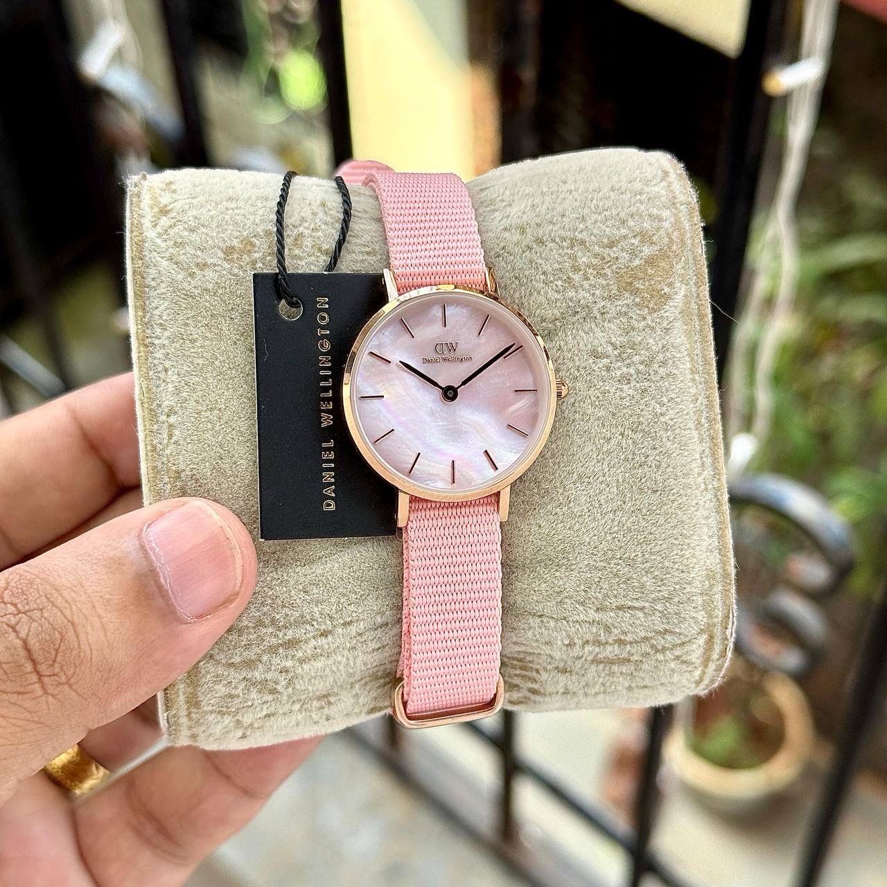 The iridescent Pink MOP dial reveals natural pearly patterns that shimmer uniquely in every light, making each watch one of a kind. Slim rose-gold hour markers preserve the clean and minimalist DW aesthetic, while the lightweight blush pink nylon strap adds comfort, durability, and a fresh modern look.